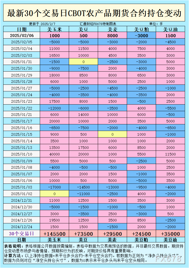 汇通财经APP讯——周五(2月7日),CBOT谷物市场在多重因素的推动下呈现出分化的走势。小麦期货因黑海地区天气担忧升至四个月高位,而玉米和大豆期货则因南美天气问题及市场对贸易冲突的担忧缓解而持稳于数月高点附近。本文将通过分析CBOT持仓变动及其传递出的市场情绪,结合基差和国际交易动态,探讨小麦、大豆、豆油、豆粕和玉米的未来走势。