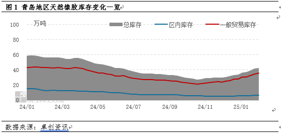 据卓创资讯统计,截至1月31日当周,青岛地区天然橡胶样本仓库库存42.59万吨,较2024年12月底增加8.86万吨,增幅26.27%,累库节奏加快(2024年12月底库存环比增幅14.69%)。其中,保税区内库存6.90万吨,较2024年12月底增加1.01万吨,增幅17.15%;一般贸易库存35.69万吨,较2024年12月底增加7.85万吨,增幅28.20%。月内穿插春节假期,伴随下游工厂节前备货结束以及启动放假计划,需求端明显放缓,主要仓库出库节奏受限,青岛地区天然橡胶库存加速累库。