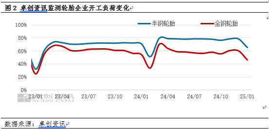 1月份穿插春节假期,下游工厂存在放假预期。鉴于2024年轮胎原材料成本增加明显,多数轮胎厂提前部署春节原料备货计划,进入1月份后,多数轮胎厂基本完成节前备货,伴随春节假期的临近,部分工厂采购节后到港船货,现货交易明显减少。据卓创资讯监测,1月份山东地区轮胎企业全钢胎平均开工负荷46.26%,较上月开工走低13.83个百分点,较去年同期走低7.99个百分点;半钢轮胎生产企业月均开工负荷65.51%,较上月走低13.21个百分点,与去年同期相比走低5.47个百分点。
