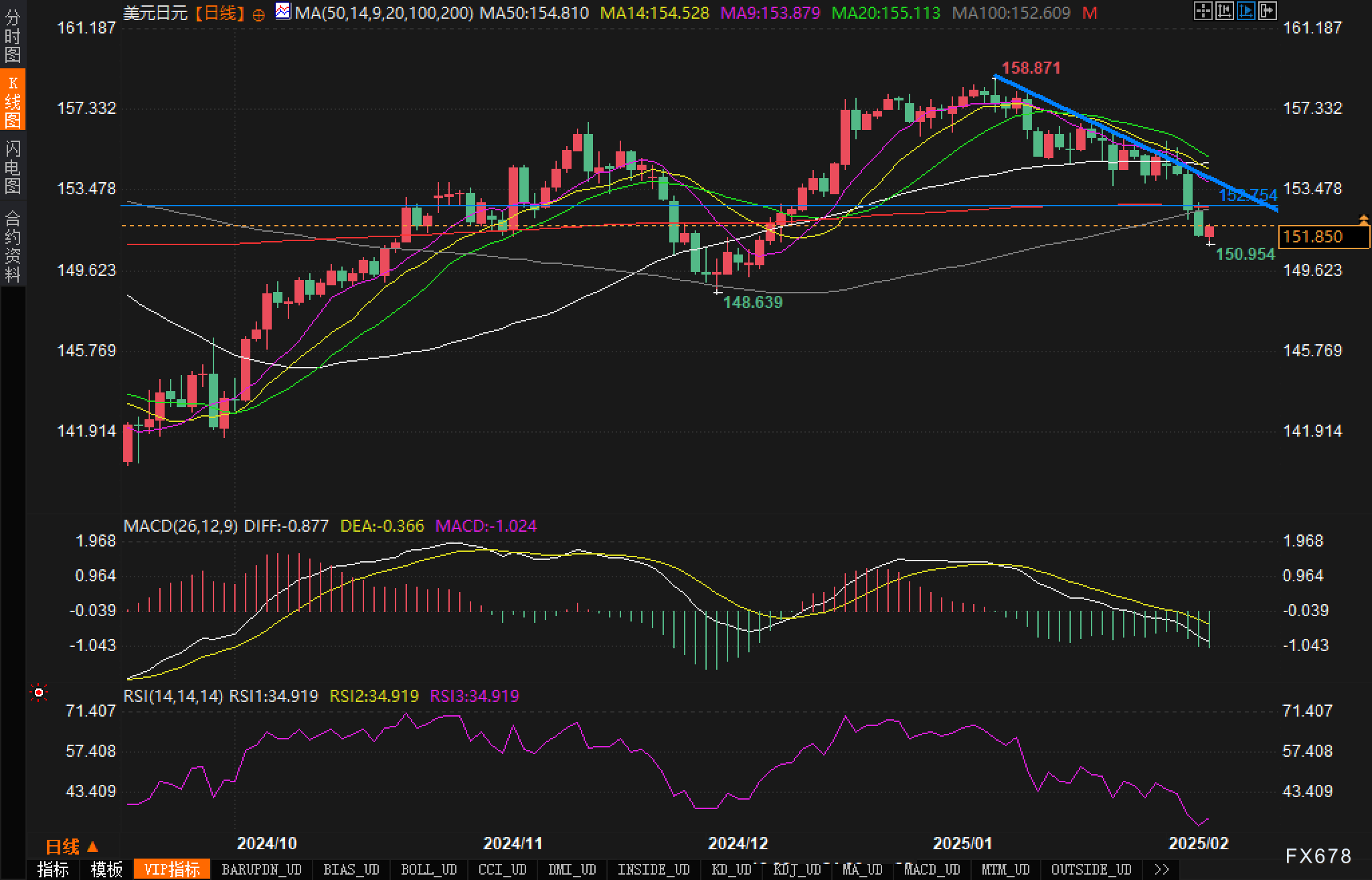 从技术面来看,美元/日元本周的走势呈现出较为明显的下行趋势。价格跌破152.50-152.45的支撑区间,这一区域原本由100日和200日均线共同构成,曾是强有力的支撑位。突破这一关键支撑位,成为市场看空美元/日元的关键信号。