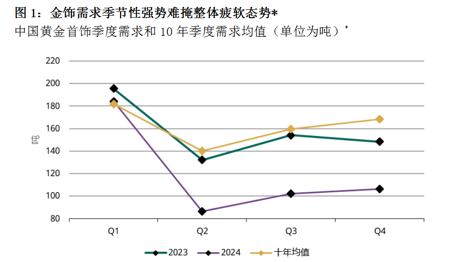 但2024年四季度金饰需求仍较2023年同期下降28%,较长期均值低了37%。2024年中国市场金饰需求较2023年下降24%,较10年均值低26%。2024年金饰需求的疲软主要可以归因于消费者的购买力下降和金价飙升原因。
