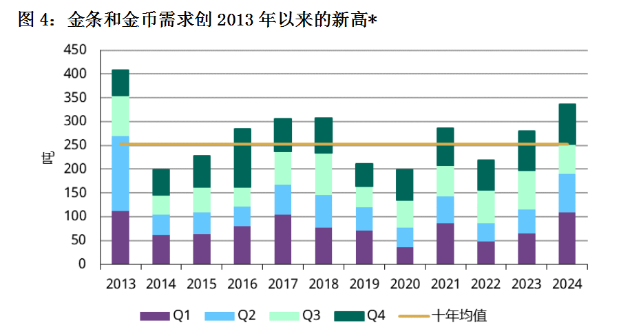 金条和金币需求方面,2024年四季度需求显著回升,较上季度环比增长35%,年同比小幅增长1%,创下8年以来最强劲的四季度表现。2024全年金条和金币需求量较2023年增长20%,是自2013年以来的最高水平。
