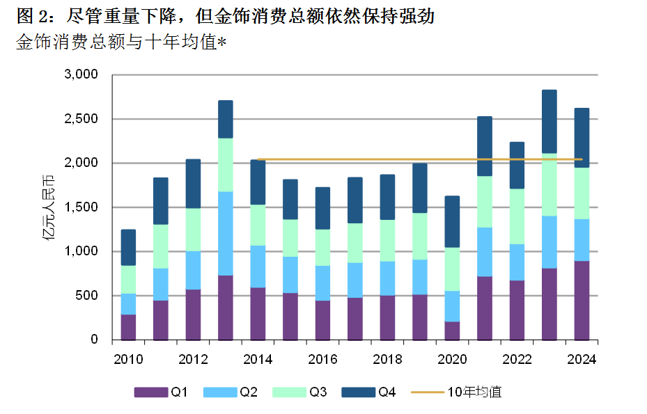 *基于需求吨数与季度平均Au9999金价。十年均值为2014年至2023年间的季度均值。