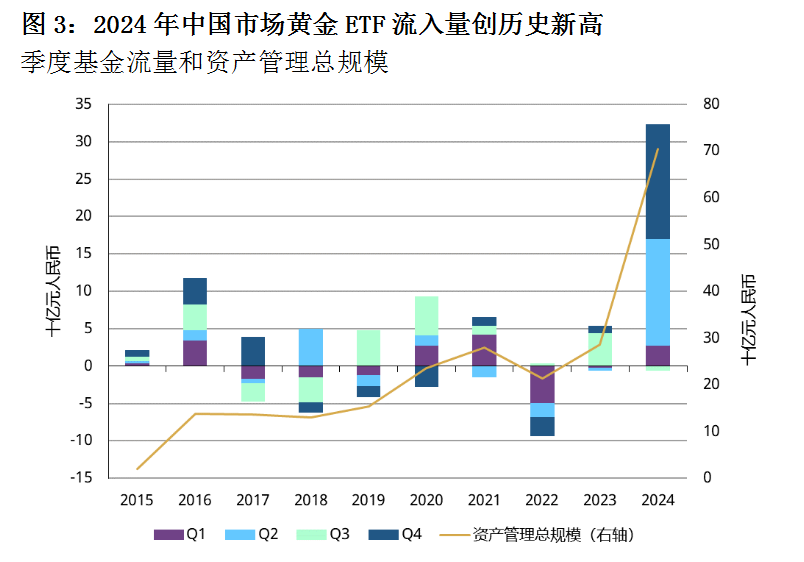 2024年四季度以及全年的中国黄金ETF(交易所交易基金)需求均创历史新高。截至2024年底,资产管理总规模(AUM)达710亿元人民币(约合97亿美元),跃升150%;总持仓飙升87%至115吨,同样打破纪录。强劲的金价表现、利率的显著下滑及国内资产的不确定性共同推动国内黄金ETF投资需求激增。