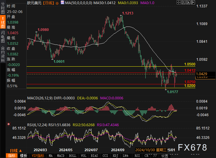 欧元/美元(EUR/USD)在近期的走势中展现了较大的波动,短期内面临重要的技术阻力与支撑。根据FXStreet的分析,欧元在1.0210的三周低点附近出现反弹,但上涨势头被50日简单移动平均线(SMA)1.0412处的压力所限制,进一步上涨面临较大挑战。