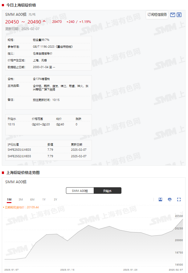 现货方面,据SMM现货报价显示,2月7日SMM A00铝现货报价涨至20450~20490元/吨,均价报20470元/吨,较春节前的20120元/吨上涨350元/吨,涨幅达1.74%。