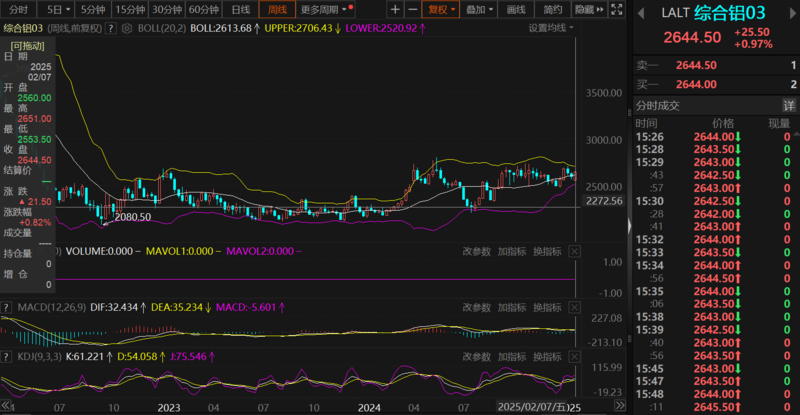 伦铝方面,周线同样呈现上涨态势,截至15:52分,伦铝以0.97%的涨幅报2644.5美元/吨,周线上涨0.82%。