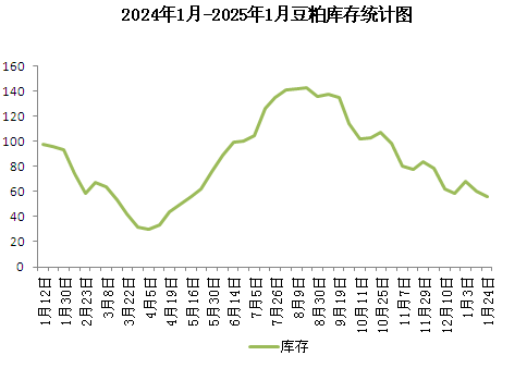 库存:根据生意社豆粕库存统计图可以看出,2024年9月过后,库存压力有所缓解。国庆期间,大豆油厂停工检修,豆粕库存不断下降,一直降至年底,降至60万吨,下降超40%。截止2025年1月24日当周,豆粕库存约55万吨,再创新低。春节期间,大豆油厂停机检修居多,豆粕继续保持低位,提振豆粕行情走高。