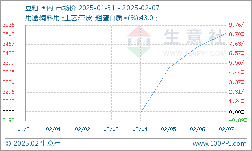 据生意社商品分析系统显示,春节过后,外盘拉涨,豆粕期货行情走高,现货行情纷纷上涨,豆粕市场均价突破3500元大关。1月31日,豆粕市场均价3222元/吨,2月7日,豆粕市场均价3508元/吨,价格上涨8.88%。