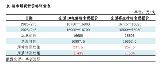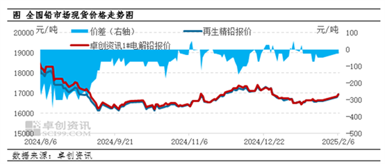 本周再生铅价格震荡上行。截至2025/2/6,卓创资讯全国再生精铅含税主流出厂价格16900—16950元/吨,均价16925元/吨,较1月23日涨350元/吨,涨幅2.11%;较去年同期涨825元/吨,涨幅5.12%;今年累计涨200元/吨,涨幅1.20%。本周均价16862.5元/吨,较前一周均价涨257.5元/吨,涨幅1.55%。