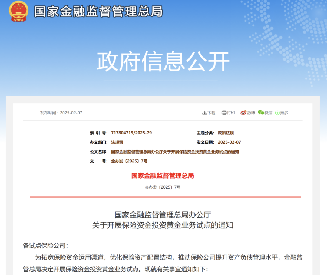 2月7日,国家金融监督管理总局官网发布《关于开展保险资金投资黄金业务试点的通知》,从试点内容、试点要求及监督管理三个方面对险资投资黄金提出明确要求。