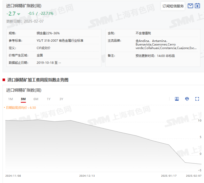 节后归来,矿端供应偏紧的态势仍在持续,周内铜精矿现货市场持续恶化,出现多种形式的压价行为。2月7日SMM进口铜精矿指数(周)报-2.70美元/吨,较上一期的-2.20美元/吨减少0.5美元/吨。
