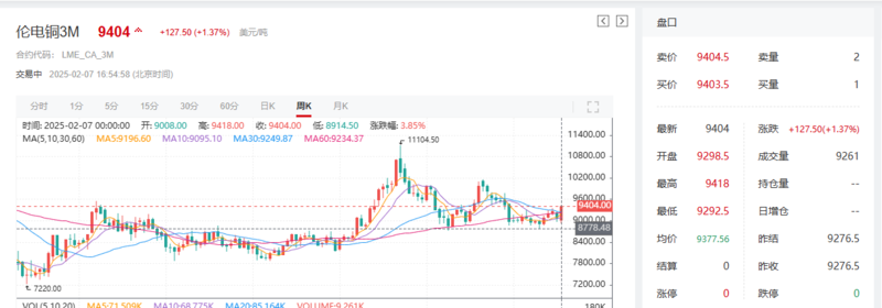节后归来,伴随着市场对美国关税政策可能引发全球贸易冲突的担忧有所缓解,虽然外围宏观不确定性仍存,但多家海内外机构被Deepseek征服看多中国资产以及市场对国内宏观利好政策的预期,带动了市场做多信心的回升,叠加周内铜精矿现货市场持续恶化,使得铜价即使面对国内铜库存大幅累库也出现了明显的上涨,截至2月7日16:54分,伦铜涨1.37%,报9404美元/吨,创2个多月以来的新高,其本周周线涨幅暂时为3.35%,有望录得四个多月来的最佳周度表现;沪铜涨1.77%,报77250元/吨,其本周周线涨2.25%。