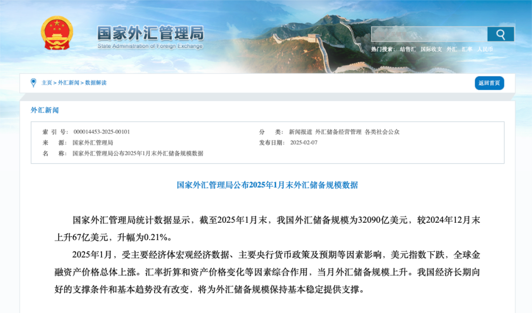 数据显示,截至2025年1月末,我国外汇储备规模为32090亿美元,较2024年12月末上升67亿美元,升幅为0.21%。