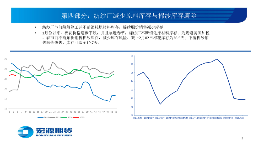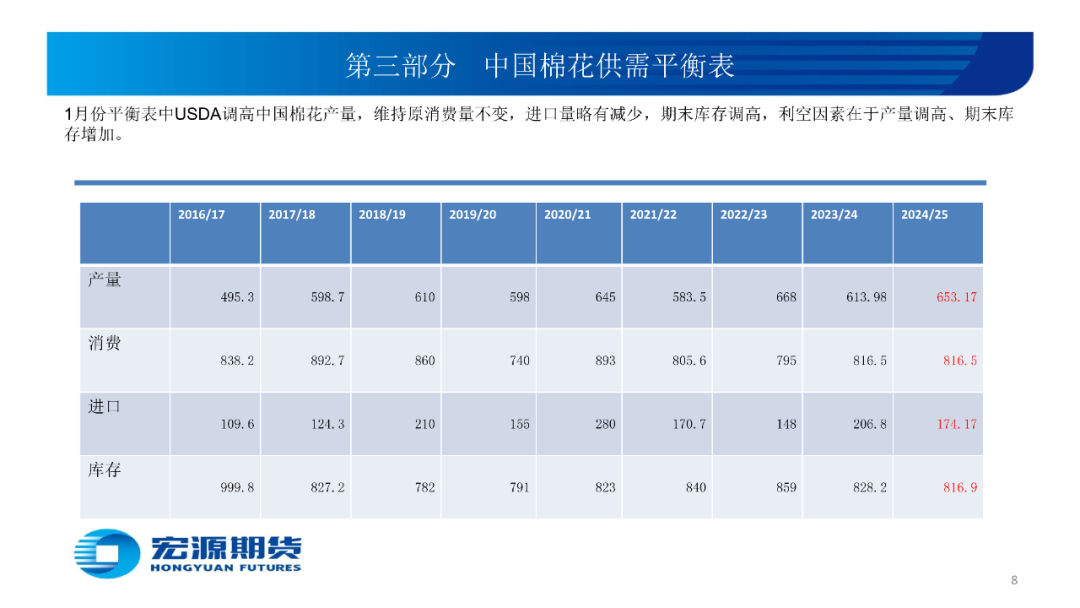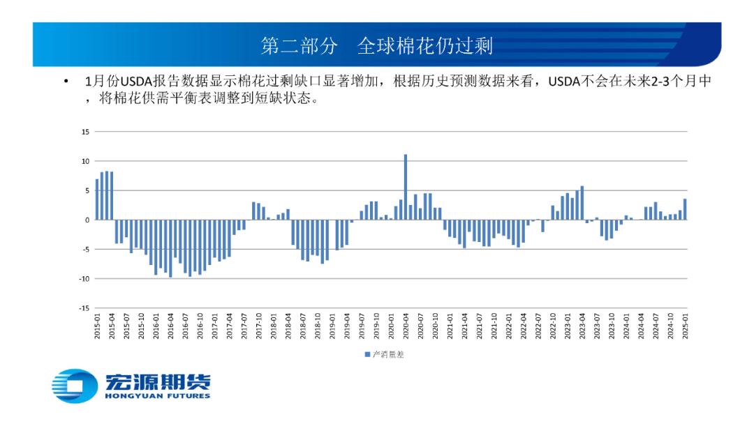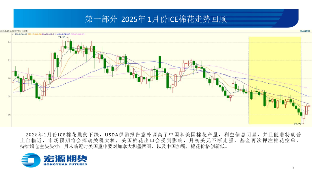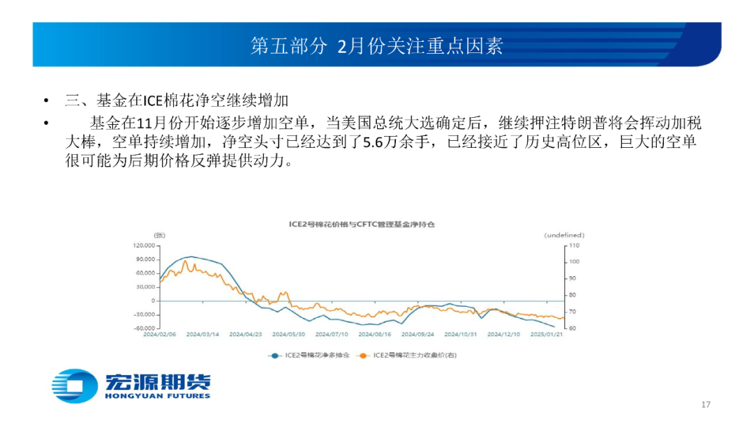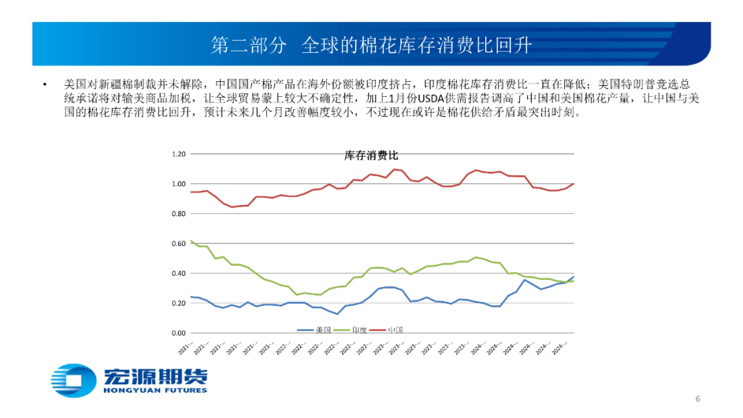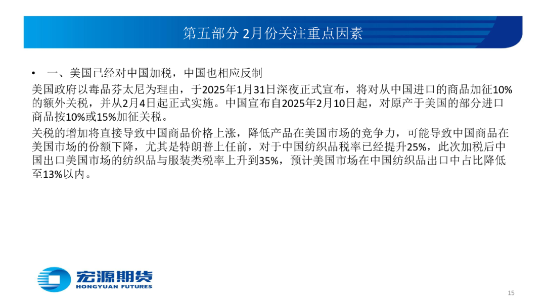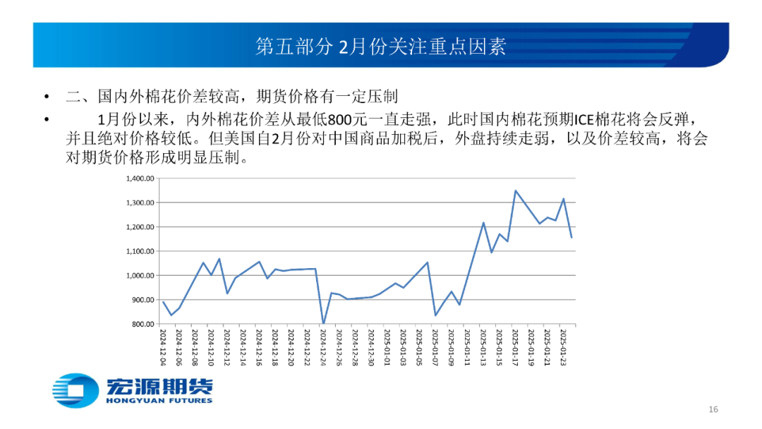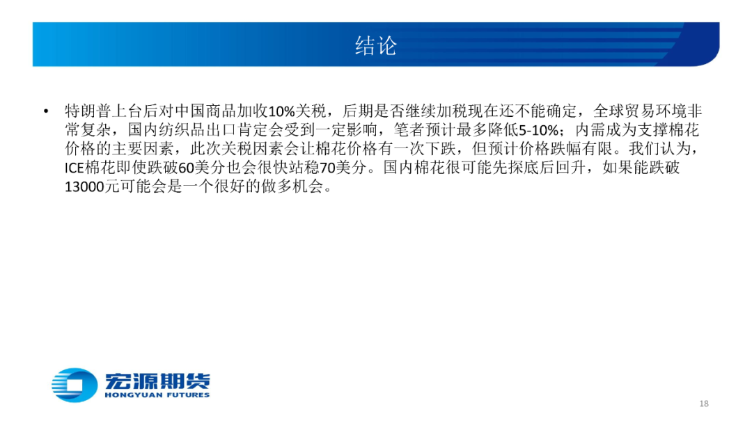 特朗普上台后对中国商品加收10%关税,后期是否继续加税现在还不能确定,全球贸易环境非常复杂,国内纺织品出口肯定会受到一定影响,笔者预计最多降低5-10%;内需成为支撑棉花价格的主要因素,此次关税因素会让棉花价格有一次下跌,但预计价格跌幅有限。我们认为,ICE棉花即使跌破60美分也会很快站稳70美分。国内棉花很可能先探底后回升,如果能跌破13000元可能会是一个很好的做多机会。