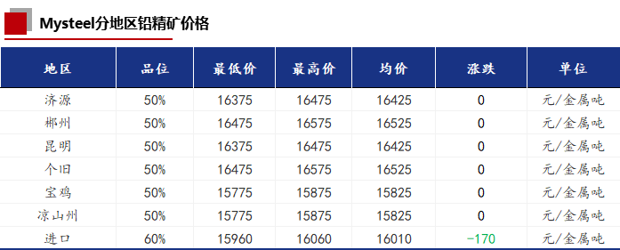 今日受铅锭价格影响,铅精矿价格较上一交易日持平元/金属吨。铅精矿加工费各地区均未调整,较上一交易日持平。进口铅精矿价格较上一交易日跌170元/金属吨。