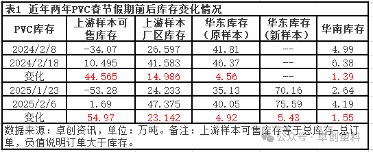 从绝对量数据来看,2025年2月6日上游样本企业可售库存1.69万吨,较去年春节后低8.805万吨,上游样本企业厂区库存47.375万吨,较去年春节后高5.792万吨。这个数据说明今年上游PVC生产企业订单好于去年,但提货不及去年,主要原因是今年春节前华东SG-5价格在5010元/吨,而去年春节前华东SG-5价格在5675元/吨,今年价格处于历史低位,一方面下游囤货需求比往年要略好,另一方面今年春节前基差相对合适,套保商套货较多。所以今年上游企业订单的较好并非需求好,而是部分下游投机以及套保商采购为主,套保商采购后一般不急于提货,所以今年上游厂区库存高于去年。