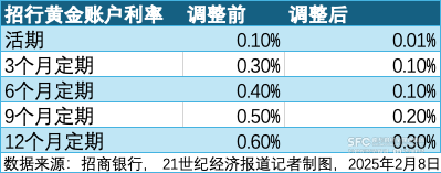 2月7日晚,招商银行发布通告,根据近期黄金市场变动情况,招行拟于2月12日起调整黄金账户业务相关的利率,其中黄金账户活期年化利率调整为0.01%、三个月期产品年化利率调整为0.1%、六个月期产品年化利率调整为0.1%、九个月期产品年化利率调整为0.2%、一年期产品年化利率调整为0.3%。