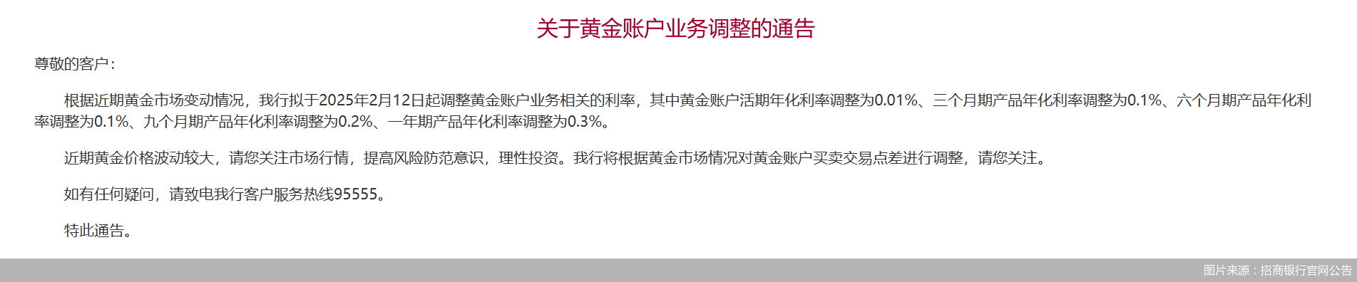 近日,招商银行发布关于黄金账户业务调整的通告,宣布拟于2月12日起调整黄金账户业务相关的利率,其中黄金账户活期年化利率调整为0.01%、三个月期及六个月期产品年化利率均调整为0.1%、九个月期产品年化利率调整为0.2%、一年期产品年化利率调整为0.3%。