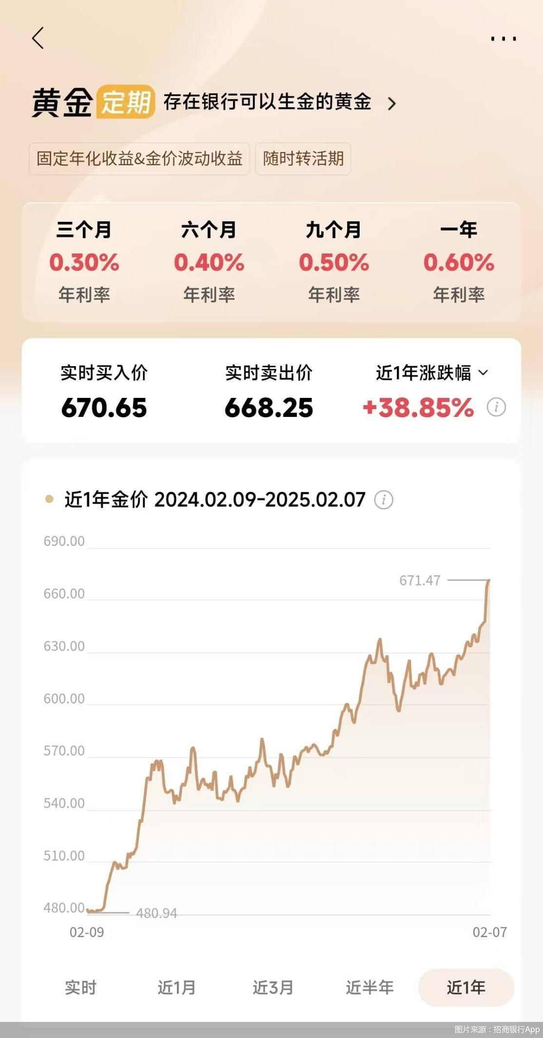 北京商报记者注意到,招商银行黄金账户业务为中风险黄金投资产品,包括固定年化收益和金价波动收益,存入期间主要享有固定年化收益,而金价波动收益主要体现在买入或卖出时。此次黄金账户利率下调影响的是固定年化收益,意味着存入期间的生息收益有所减少,从金价波动收益来看,招商银行App显示,近一年涨幅为38.85%,近一个月涨幅为6.58%。