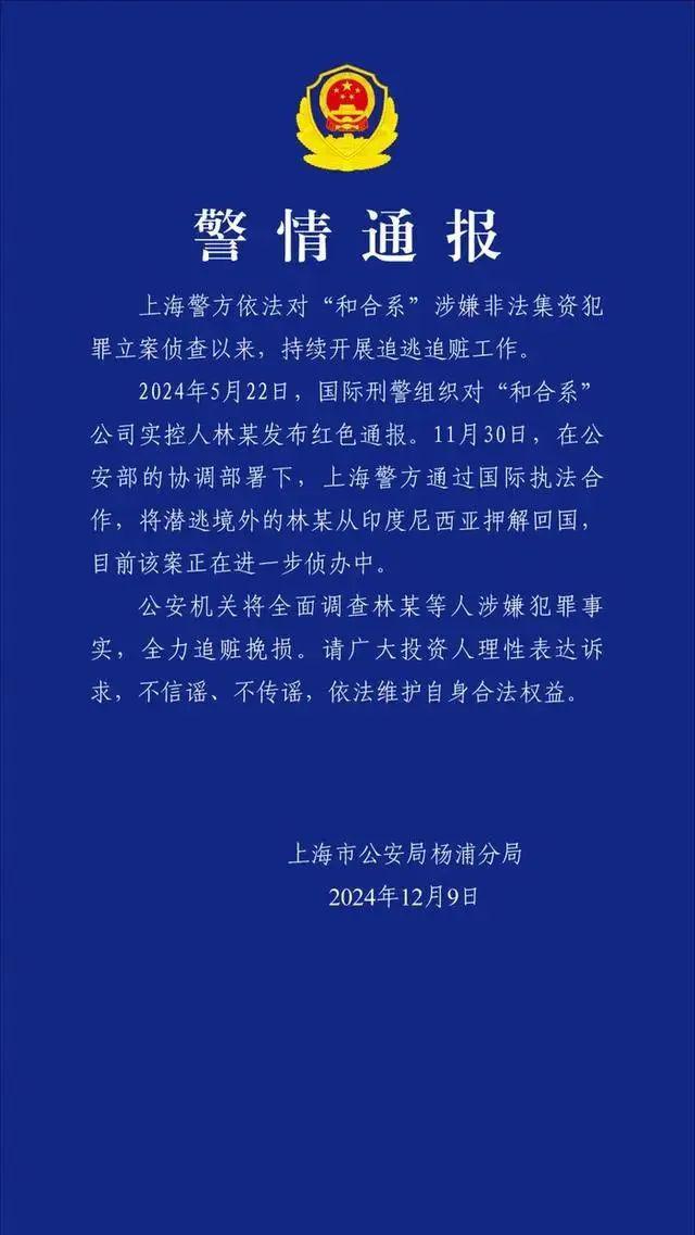 2024年12月9日,上海市公安局杨浦分局发布警情通报,上海警方依法对“和合系”涉嫌非法集资犯罪立案侦查以来,持续开展追逃追赃工作。