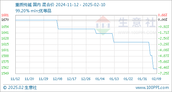 2月10日,生意社重质纯碱基准价为1560.00元/吨,与本月初(1620.00元/吨)相比,下降了-3.70%。