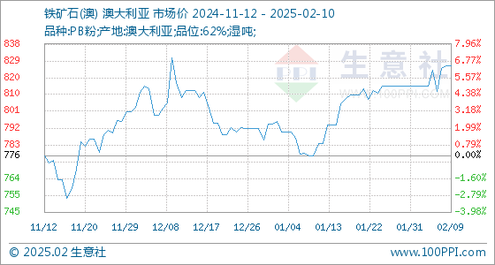 2月10日生意社铁矿石(澳)基准价为827.00元/吨