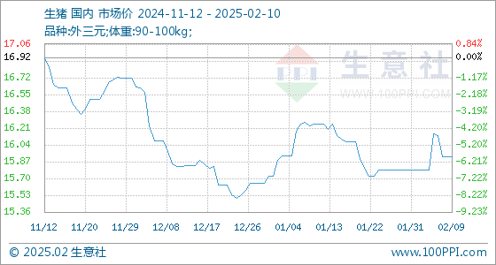 2月10日,生意社生猪基准价为15.92元/公斤,与本月初(15.78元/公斤)相比,上涨了0.89%。