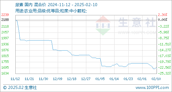 2月10日,生意社尿素基准价为1685.00元/吨,与本月初(1741.67元/吨)相比,下降了-3.25%。
