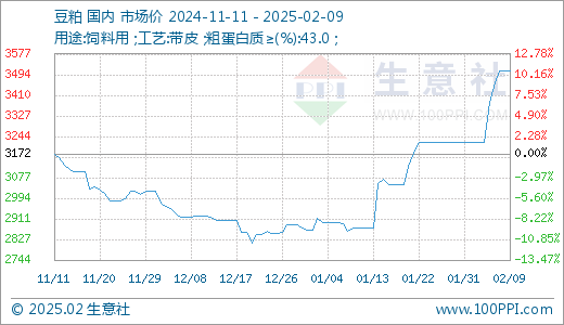 02月09日豆粕3508.00元/吨5天上涨8.88%