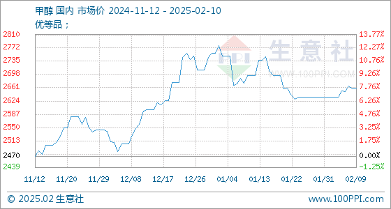 2月10日,生意社甲醇基准价为2659.17元/吨,与本月初(2635.83元/吨)相比,上涨了0.89%。