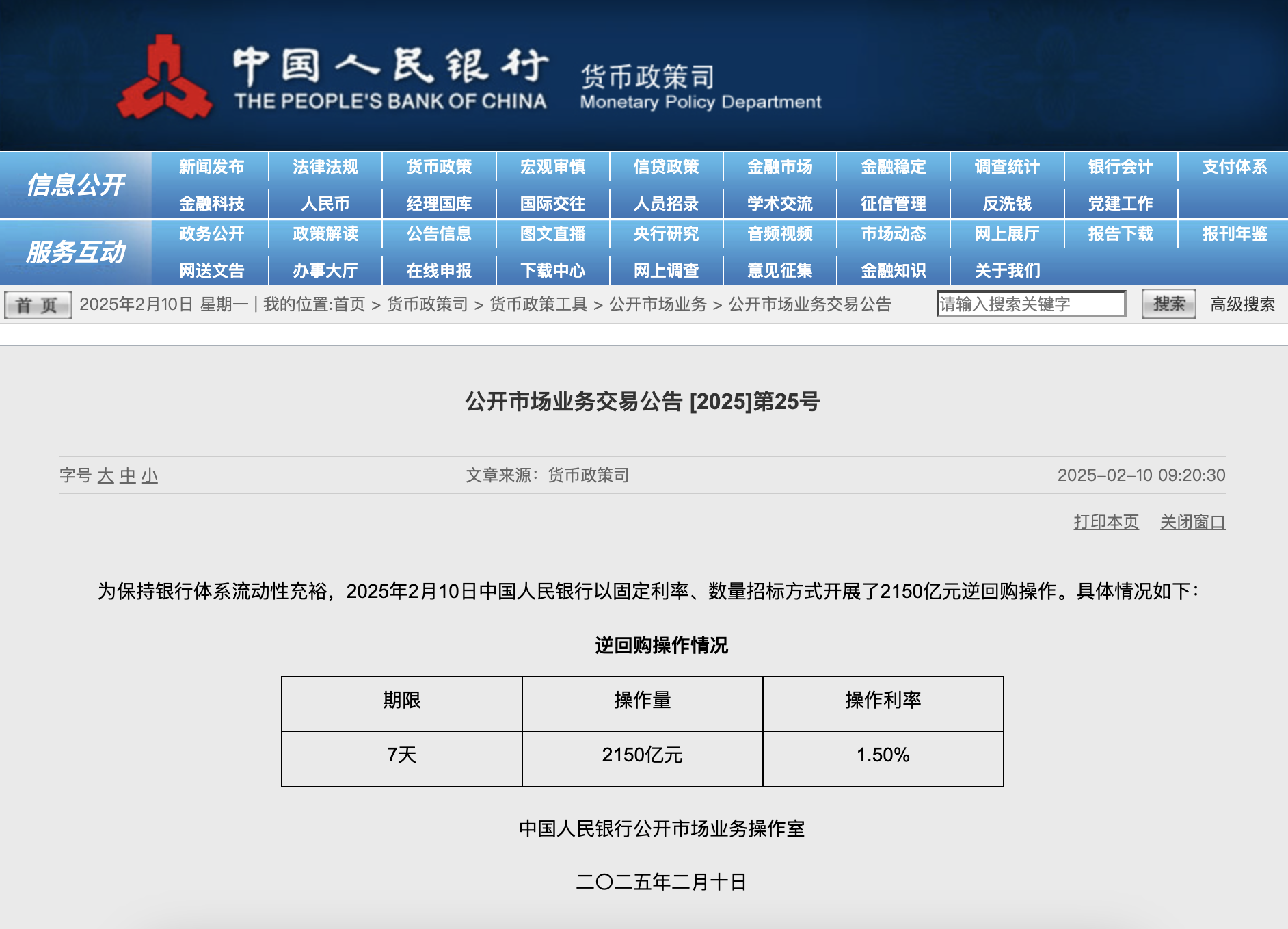 证券时报网讯,据央行网站消息,为保持银行体系流动性充裕,2025年2月10日中国人民银行以固定利率、数量招标方式开展了2150亿元7天期逆回购操作。