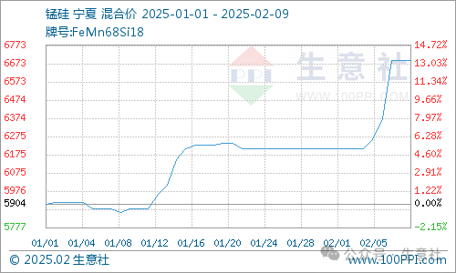 春节过后,锰硅市场受锰矿、期货联动上涨影响,高价情绪较为明显。虽然大部分工厂刚刚开市报价情绪不高,观望为主,但随着原材料成本不断推高,市场主流报价重心也在上移。据生意社商品行情分析系统,截止2月9日锰硅宁夏地区的市场报价在6600-6900元/吨左右,市场均价6690元/吨,与节前相比上涨7.73%。