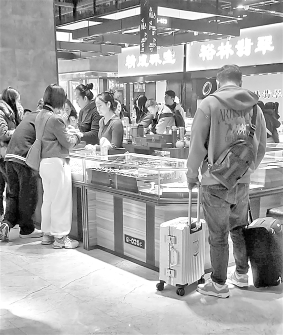 2月6日,记者走访深圳水贝黄金珠宝集聚区,看到不少拉着行李箱的外地游客在选购金饰。有外地游客表示,深圳水贝这边的价格比较实惠,所以前来“跨城”买金。不过记者发现目前水贝的金饰价格已经达到每克680元左右,回收价格在每克650元左右。“春节假期前来这边逛了逛,当时金价是650元,没想到过了一个假期就涨了30元。”现场一位消费者对记者说。而在一些品牌金饰店,金价已经达到每克860元。有消费者表示,品牌金饰的金价加上手工费后几乎达到每克1000元,有点“接受不了”。