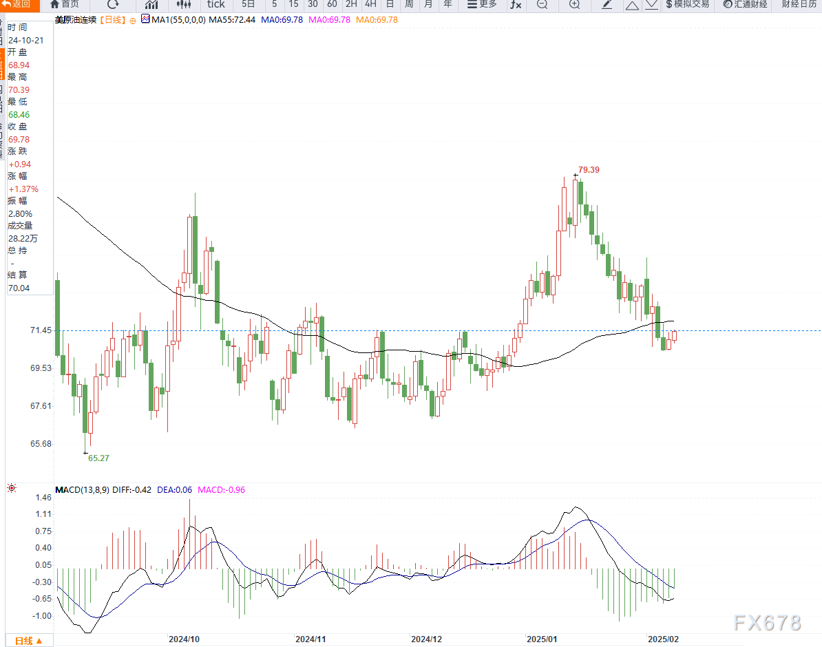 技术层面上来看,美原油日线已经跌破55日均线支撑,同时MACD加速走低,短期尚未形成止跌迹象,等待反抽72美元附近确认压力是否有效,若跌破70美元整数关,则不排除油价加速下行的可能性。