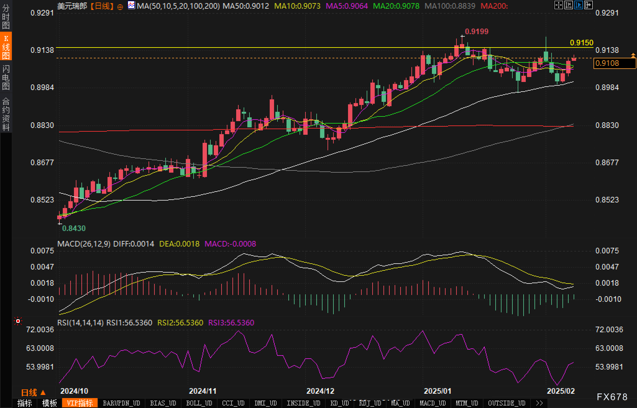从基本面角度看,美国较为稳健的就业数据、适度下降的失业率以及美联储维持利率不变的预期,均为美元提供了支撑;而特朗普政府的关税政策和全球经济不确定性则使得降息预期下降,使美元指数稳中有升。同时,瑞郎受益于瑞士央行政策趋稳及避险资金流入,短期内可能对美元构成一定压力。技术面上,美元/瑞郎在0.9110关键价位附近运行,短期内呈现上行趋势,但未来走势需谨慎判断。