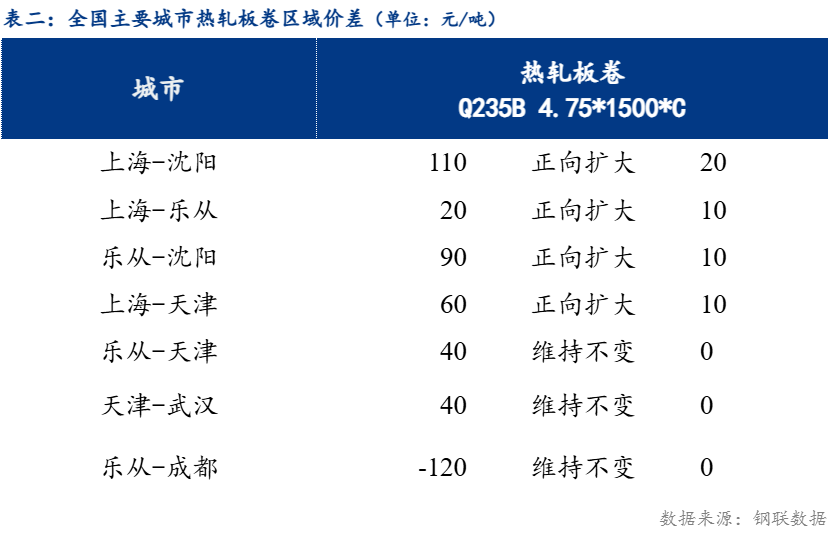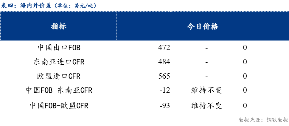 从区域价差来看,华东与东北价差110元/吨,较上一交易日正向扩大20元/吨;华东与华南价差20元/吨,较上一交易日正向扩大10元/吨;华南与华北价差为40元/吨,较上一交易日维持不变。