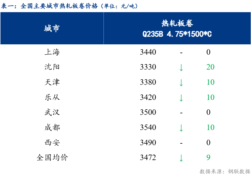 截止发稿时4.75热轧板卷全国均价3472元/吨,较上一交易日下跌9元/吨。其中主要城市价格为上海3440元/吨,沈阳3330元/吨,天津3380元/吨,乐从3420元/吨,武汉3500元/吨,成都3540元/吨,西安3490元/吨。
