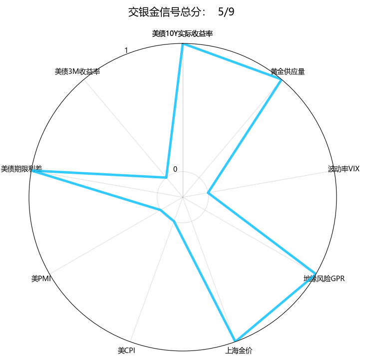 交银投顾最新的黄金投资信号为5分:从宏微观9个维度来分析判断,我们认为目前黄金整体处于中性偏乐观的状态。具体各维度表现如下: