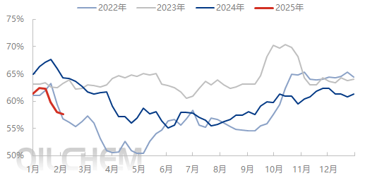 截止2月6日,中国成品油独立炼厂常减压产能利用率为57.56%,环比上周下跌0.46个百分点。山东、华北等大区部分炼厂开始新一波检修及降负,产能利用率回落。