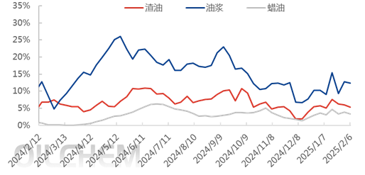 截止2月6日,山东油浆市场库存率12.4%,较节前涨3.0个百分点。山东地区渣油库存率5.4%,较上周期跌0.9%,山东地区蜡油库存率3.3%,较上周期跌0.1个百分点。