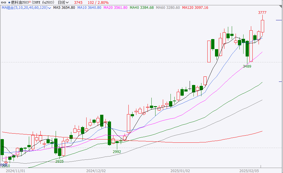 国际油价上涨,成本支撑增强;同时炼厂燃料油供应偏紧。燃料油涨势加速,盘中最大涨幅超3.5%。2503主力合约收盘收在3745元/吨,涨幅2.80%。