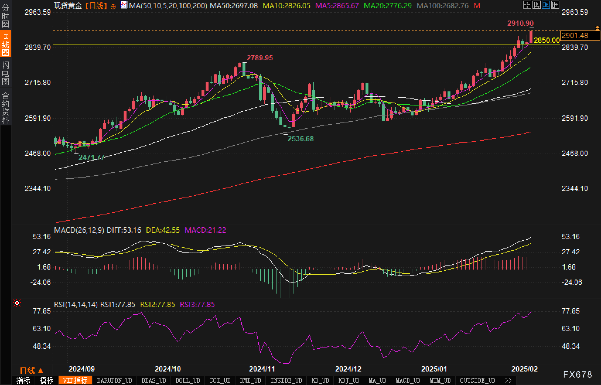 从技术图形角度观察,当前(2月10日)黄金价格正处于每盎司2900美元的关键区域,市场多头情绪依然浓厚。技术分析师普遍认为,若金价能够在2900美元以上稳固站稳,后市将有望进一步上攻至3000美元的心理关口。现阶段,技术指标显示,MACD指标和相对强弱指数(RSI)均已超过超买水平,表明市场上行动能强劲,但同时也提示短期内可能出现一定的震荡调整。支撑方面,若金价出现回调,关键支撑位可能落在2850美元左右。
