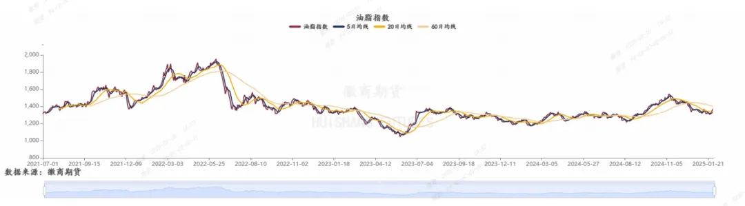 油脂指数上涨4.333%。棕榈油:东南亚棕榈油产地正处于季节性减产期,整体供应偏紧,1月份马来西亚种植园受持续降雨影响,延续减产走势,根据SP OMA预计马棕1月产量环比降15.19%,同时路透数据显示,1月份马来西亚棕榈油产量预计为132万吨,环比 下降11%,连续第五个月产量下降,创下近一年来最低值。不过受全球棕榈油价格相对高企,印度进口棕榈油的炼油利润率为负,促使印度转向价格更低廉的豆油和葵花籽油,据印度交易商估计,印度1月棕榈油进口量较上月锐减46%至27.2万吨,为2011年3月 以来的最低水平。印尼和马来西亚棕榈油出口国受到其印度进口需求减少的影响,根据船运数据显示,1月份马来西亚棕榈油出口 环比下降8.98%-20.14%,据路透数据预估棕榈油出口量为115万吨,环比减少14.64%,连续三个月出口下滑,创下近一年来最低值。马来西亚棕榈油供需双弱,预计1月棕相油库存降至165万吨,较12月下降3.45%,库存连续四个月下降,况且2月份是季节性减 产尾声,叠加斋月备货即将开启,2-3月存在开斋节刚需采购,印度棕榈油到港量或许会较1月有所增加,2月马棕库存预计仍在历 史同期低位,有望继续提振棕榈油行情震荡上行。