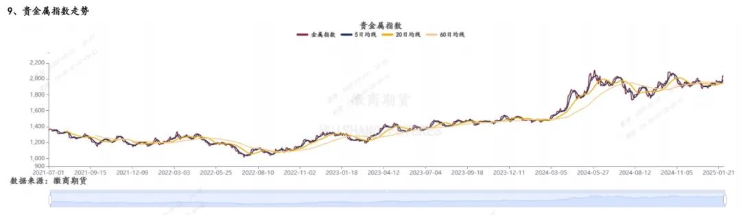 贵金属指数上涨4.66%。美国关税威胁引发市场担忧,避险情绪主导下,贵金属或震荡偏强为主。特朗普关税政策反复,2月1日签 署行政令,对进口自中国的商品加征10%的关税。根据行政令,美国还将对进口自墨西哥、加拿大两国的商品加征25%的关税,其中 对加拿大能源产品的加税幅度为10%。2月3日,美国向墨西哥和加拿大商品加征关税的计划将暂缓一个月实施,关税计划面临较大 变数。市场风险偏好有所修复,美元指数高位回落,现阶段特朗普关税政策具有较强的“工具属性”,即外交谈判弹性较大,这也 暗示未来市场波动将围绕关税政策谈判进展。短期美元指数涨势暂缓,对大宗商品利多。同时,由于美国关税政策仍具有不确定性,避险情绪对贵金属的支撑或长期存在,短期贵金属或震荡偏强,重点关注政策执行情况,以及3月美联储议息会议点阵图的更 新。中期来看,市场交易的逻辑或在经济表现以及各项政策落地情况,若经济持续表现超预期,降息预期或进一步调整,贵金属中期或宽幅震荡为主。长期而言,抗通胀和避险需求将继续支撑贵金属价格,在通胀预弹、货币政策宽松和大财政政策支撑下,贵金 属仍具有上涨空间。