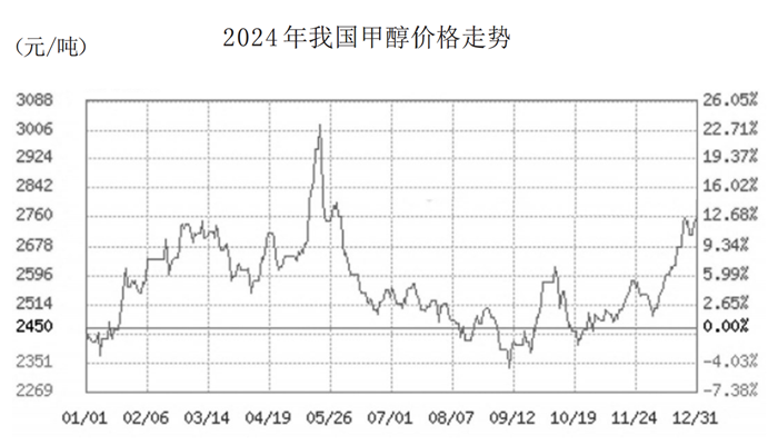 2024年,国内甲醇价格宽幅震荡,由年初的2450元(吨价,下同)涨至年底的2758元,全年涨幅12.57%。2024年价格最高点3020元出现在5月下旬,最低点2338元出现在9月上旬,全年价格最大振幅为29.17%,均价为2567.67元。