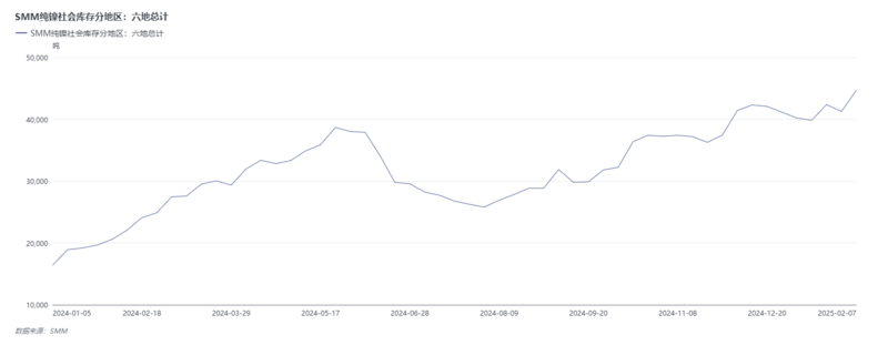 据SMM数据显示,1月SMM纯镍社会库存呈现累库态势,截至1月24日,SMM纯镍社会库存总计41273吨,较2024年12月27日的41169吨累库104吨,累库幅度达0.25%。