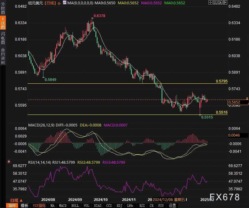 汇通财经APP讯——周二(2月11日),纽元兑美元(NZD/USD)汇率测试了位于0.5650附近的九日指数移动平均线(EMA)阻力位,最新报0.5648,日内上涨了0.16%。在结束了连续三日的下行后,纽元兑美元正在尝试确定其后续走势,但从技术指标来看,市场呈现出较为混杂的信号。本文将分析影响纽元兑美元汇率的关键因素,重点关注当前市场动态和未来的走势展望。