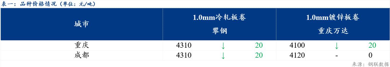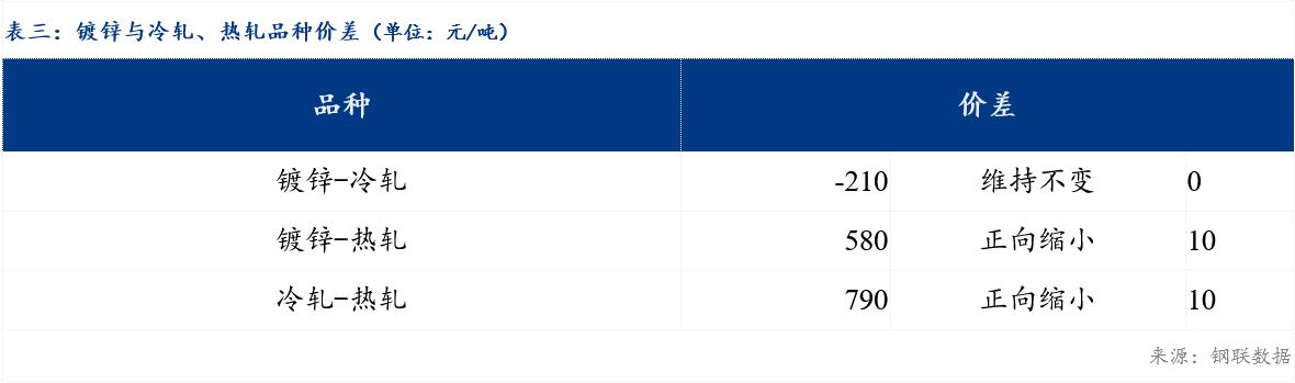 重庆、上海地区冷轧板卷区域价差缩小20元/吨,重庆、广州冷轧板卷区域价差缩小10元/吨;重庆、上海镀锌板卷区域价差扩大10元/吨,重庆、广州镀锌板卷区域价差扩大10元/吨。镀锌、冷轧品种价差维持不变;镀锌、热轧品种价差缩小10元/吨;冷轧、热轧品种价差缩小10元/吨。