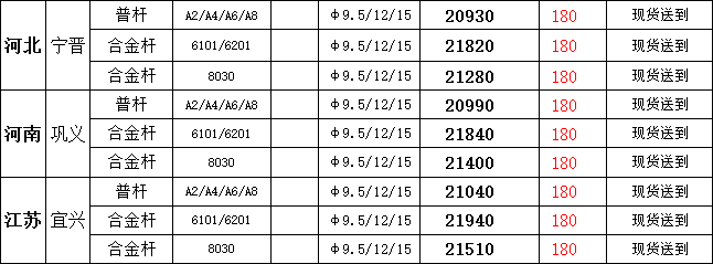 2月11日宁晋市场普铝杆现货报盘价20930元/吨,较上一交易日报价涨180元/吨;巩义市场普铝杆现货报盘价20990元/吨,较上一交易日报价涨180元/吨;宜兴市场普铝杆报盘价21040元/吨,较上一交易日报价涨180元/吨。